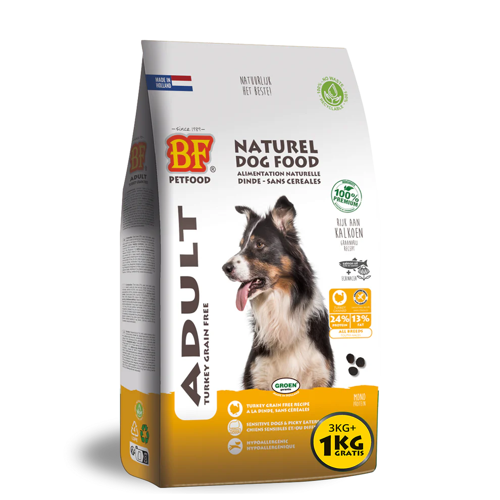 BF Petfood® Adult Kalkoen Graanvrij. Een volledige licht verteerbare en zeer smaakvolle graanvrije hondenvoeding voor volwassen en oudere honden en/of voedingsgevoelige (allergieën) en/of kieskeurige honden. Met mono-proteïne kalkoen recept, zalmolie, glucosamine en chondroïtine. Hypoallergeen en graan- en glutenvrij. Hoge acceptatie en verteerbaarheid. Zalmolie ondersteunt huid, vacht en de natuurlijke weerstand. Met Echinacea kruiden die het immuunsysteem ondersteunen. De essentiële eiwitten en vetten zorgen voor een optimale vertering, ontlasting en een goede conditie van uw hond. Ondersteunt huid, vacht, gebit en de natuurlijke afweer.
