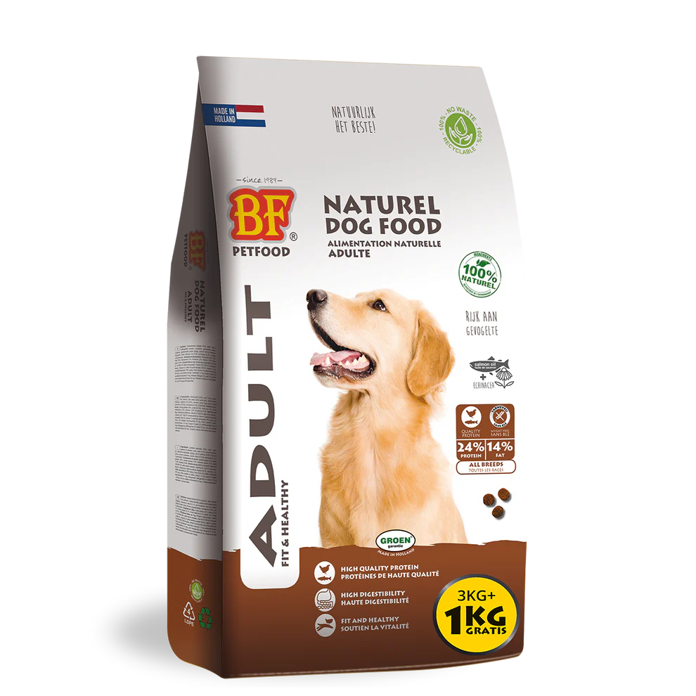 BF®Petfood Adult Krokant. Nederlandse topkwaliteit. Hoogwaardige premium en natuurlijke grondstoffen. Volledige licht verteerbare geëxtrudeerde hondenvoeding voor volwassen honden. Rijk aan gevogelte en zalm. Tarwevrij. Inuline FOS (prebiotica) stimuleert de darmflora en ondersteunt hiermee de gezondheid. Hoge acceptatie en verteerbaarheid. Optimale voeding die zorgt voor een betere vertering, ontlasting en een goede conditie van uw hond. Zonder chemische toevoegingen. Voor volwassen honden.
