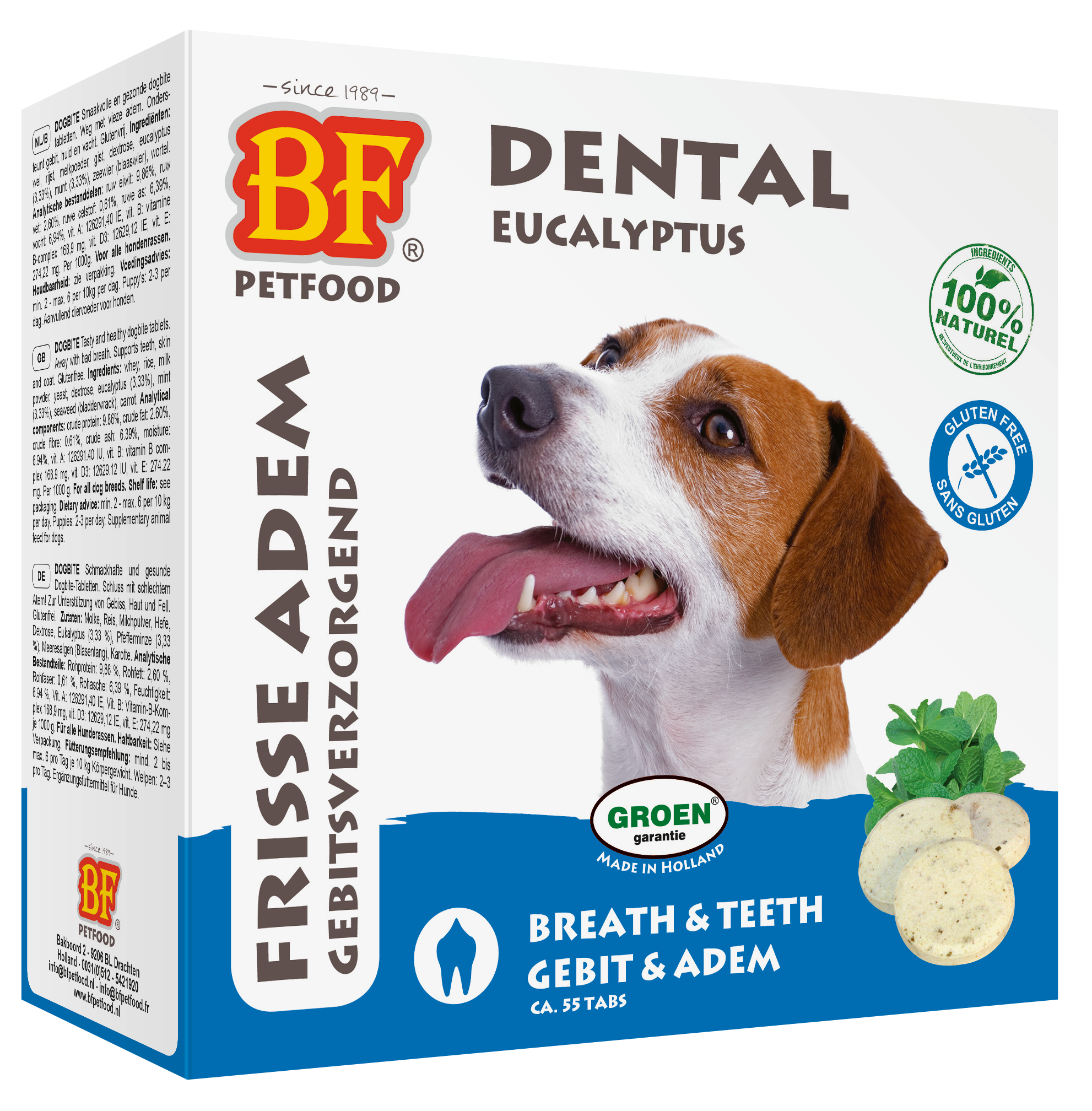 Smaakvolle en natuurlijke BF® Dental gisttabletten voor de hond met eucalyptus, pepermunt en aminozuren, vitaminen (A, B, D en E) en mineralen. De overheerlijke DENTAL tabletten werken gebitsverzorgend en zorgen voor een frisse adem. (Bier)gist bevat naast vitamine B(-complex) en vitamine D ook hoogwaardige en gezonde aminozuren, mineralen, eiwit en enzymen. Weg met vieze adem. Voor alle hondenrassen.