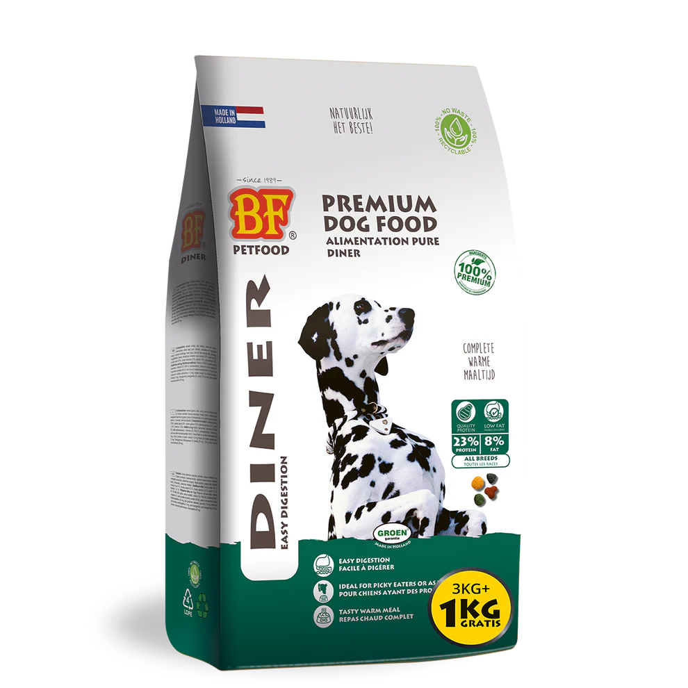 Diner is een volledige licht verteerbare hondenvoeding voor volwassen honden. Met diverse dierlijke eiwitbronnen als rund en kip en smaakvolle groenten. Hoge acceptatie en verteerbaarheid. Optimale voeding die zorgt voor een betere vertering, ontlasting en een goede conditie van uw hond. Zonder chemische toevoegingen. Voor alle hondenrassen.