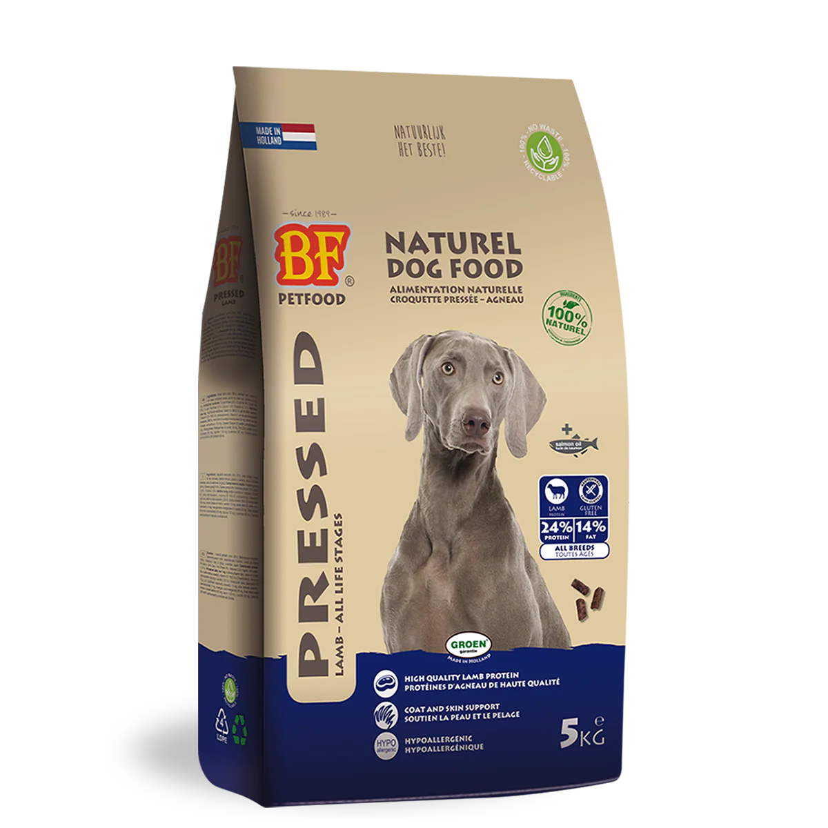 BF®Petfood Geperst Lam. Nederlandse topkwaliteit. Met hoogwaardige premium en natuurlijke grondstoffen. Volledige zeer goed verteerbare koud geperste all life stage hondenvoeding, geschikt van pup tot senior. Rijk aan lam (30%). Hypoallergeen (1 dierlijke eiwitbron: lam) en tarwe- en glutenvrij. Hoge acceptatie en verteerbaarheid. Voor voedingsgevoelige en/of kieskeurige honden en moeilijke eters. Ook geschikt voor drachtige en actieve honden. Lage maagbelasting en verhitting van de brok. Zonder chemische toevoegingen. Optimale voeding die zorgt voor een betere vertering, ontlasting en een goede conditie van uw hond. Voor alle hondenrassen en alle leeftijden.