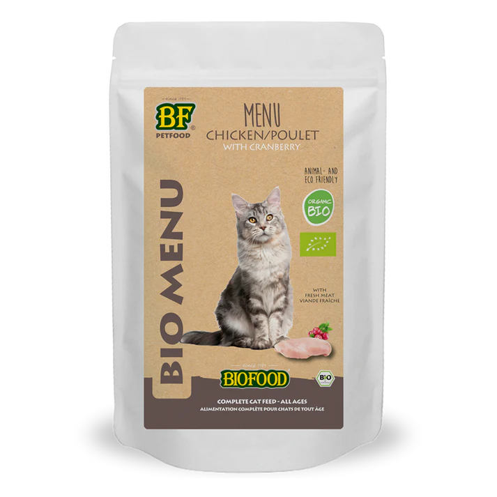 BIOFOOD® bio organic kip menu, is complete biologische vleesvoeding voor de kat. Puur, (h)eerlijk en gezond, glutenarm, heeft een hoge acceptatie, is zeer goed verteerbaar, is hypoallergeen en ondersteunt huid, vacht, vertering en nieren. Met slechts één dierlijke eiwitbron, koud gevuld, gestoomd op een gecontroleerde lage temperatuur, vrij van toevoegingen zoals kunstmatige vitaminen, vulstoffen, bindmiddelen of diermeel en dierproeven.