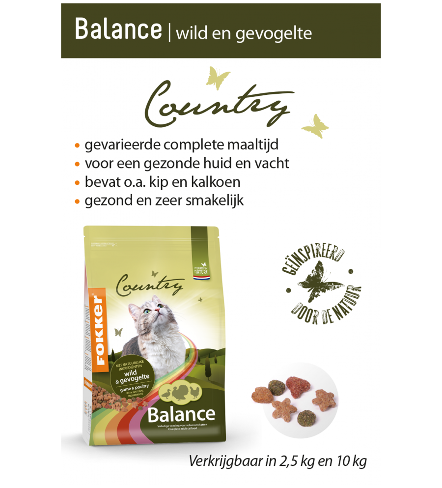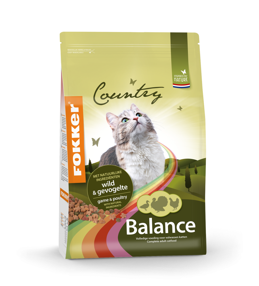 Fokker Country Balance met wild en gevogelte is een volledig diervoeder van hoge kwaliteit voor volwassen katten. De krokante brokjes zijn samengesteld uit een gevarieerde mix van hoogwaardig eend-wild én tevens hoogwaardige kip en kalkoen. Aangevuld met geselecteerde granen en groenten houdt u uw kat vitaal en gezond. Fokker Country Balance is zeer smakelijk en wordt daarom door alle katten graag gegeten.