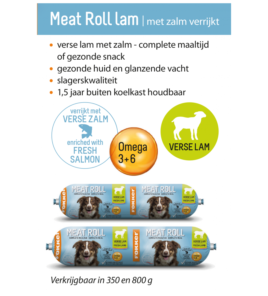 Lam 74,9%, zalm 4,7%, rijst 17,55, zalmolie 0,6%, vitaminen en mineralen.