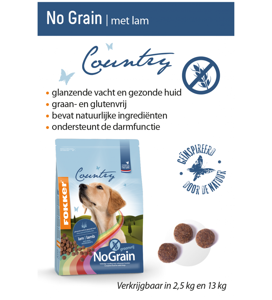 | Belangrijkste grondstoffen | Erwten, gedehydradeerde lam (49% lam gedehydrateerd), gedroogde aardappel, gevogeltevet, gedroogde bietenpulp, biergist en mineralen. |