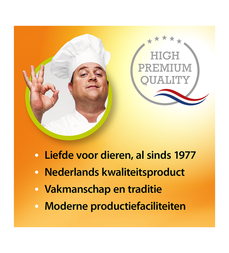 | Belangrijkste grondstoffen | Gedroogde kip (36% kip gedehydrateerd), maïs, rijst (14%), gerst, gevogeltevet, gedroogde lam (8% lam gedehydrateerd), gedroogde bietenpulp, mineralen, biergist, lignocelluose, lijnzaad, eipoeder, zalmolie, lecithine, inuline (bron van FOS), Yucca Schidegera. |