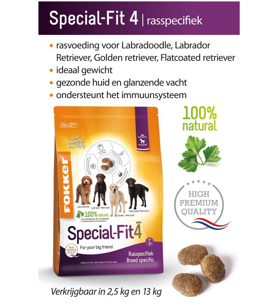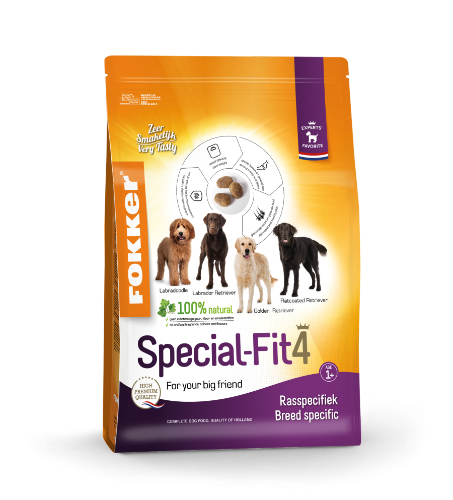 Fokker Special-Fit 4 is een High Premium hondenvoeding voor volwassen honden vanaf 1 jaar. Deze kwaliteitsvoeding bevat de beste ingrediënten en de  juiste samenstelling en is toegespitst op specifieke rassen: Golden Retriever, Labrador Retriever, Flatcoated Retriever en Labradoodle.