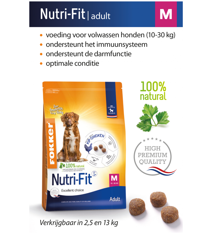 Fokker Nutri-Fit M is een high premium hondenvoeding voor volwassen honden van middelgrote rassen met een gewicht van 10-30 kg. Om in optimale conditie te blijven verdient uw hond een hoog verteerbare en energierijke voeding. Fokker Nutri-Fit M is geschikt voor honden met een gemiddeld energieverbruik. Noorse zalmolie ondersteunt een gezonde huid en een blijvend glanzende vacht.