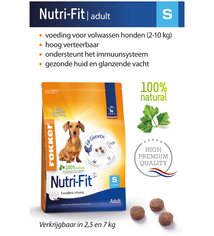 Fokker Nutri-Fit S is een high premium hondenvoeding voor volwassen honden van kleine rassen met een gewicht tot 10 kg. Om in optimale conditie te blijven verdienen kleine honden een hoog verteerbare en energierijke voeding. Fokker Nutri-Fit S bestaat uit kleine brokjes, die precies zijn afgestemd op de kaakgrootte van de kleine rassen. Noorse zalmolie ondersteunt een gezonde huid en een blijvend glanzende vacht.