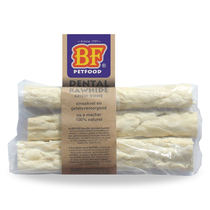 De BF® rawhide Kaantjes Stick Dental kauwkluif werkt als een soort tandenborstel, vanwege de voortdurend schurende en intensieve werking tussen kluif en gebit van uw hond. Op deze manier wordt het gebit optimaal verzorgt en houdt uw hond een gezond en schoon gebit. Daarnaast bevatten BF® kauwkluiven geen chemische toevoegingen ter “verbetering” van de uitstraling of de smaak. De smaakvolle en gezonde BF® kauwkluif geeft uw hond lang, lekker en nuttig kauwplezier.