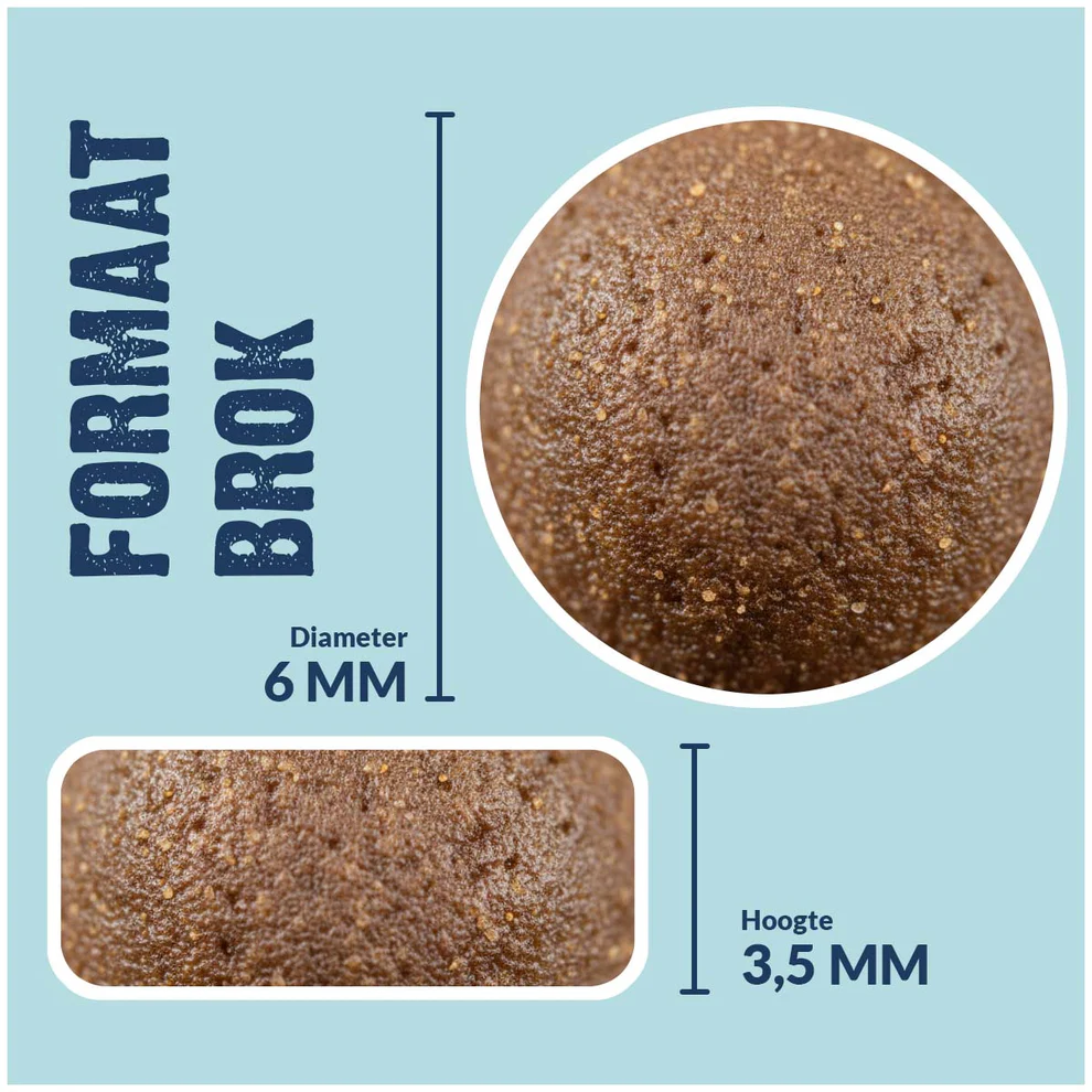 | Belangrijkste grondstoffen | verse kip (19%), gedroogde aardappel, gedroogde kip (14%), gedroogde zalm (10%), gedroogde zoete aardappel (10%), gevogeltevet, erwteneiwit, eipoeder, biergist, gedroogde bietenpulp, lignocellulose, zalmolie, inuline (bron van FOS 0,3%), lijnzaadolie. |