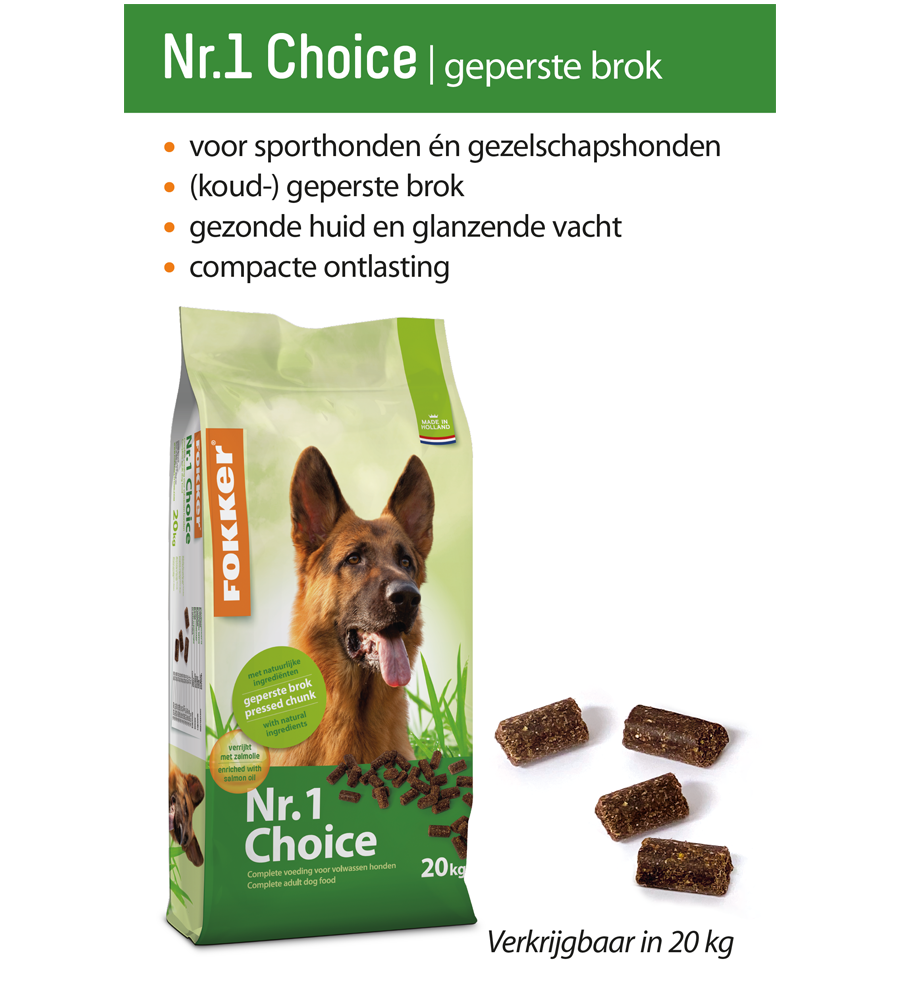 Fokker Nr. 1 Choice bevat hoog verteerbare, natuurlijke ingrediënten die uw hond fit en gezond houden. Dit product is een (koud) geperste brok. De afzonderlijke ingrediënten worden op lage temperatuur tot een brok geperst, waardoor de voedingswaarde optimaal behouden blijft. Zelfs de meest kieskeurige honden vinden Fokker Nr. 1 Choice lekker.