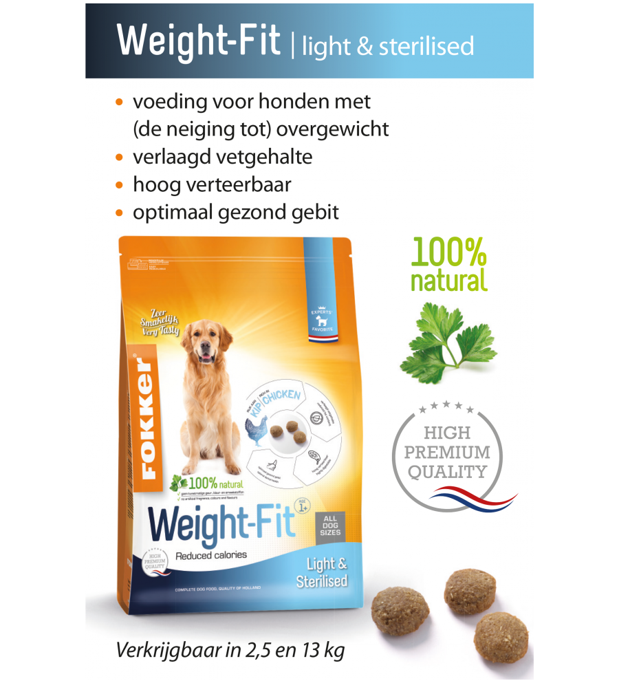 Daarnaast bevat Fokker Weight-Fit (Noorse) zalmolie, wat een blijvend glanzende vacht ondersteunt. Uw hond voelt zich zichtbaar fitter! Fokker Weight-Fit is erg smakelijk, uw hond eet het met plezier.